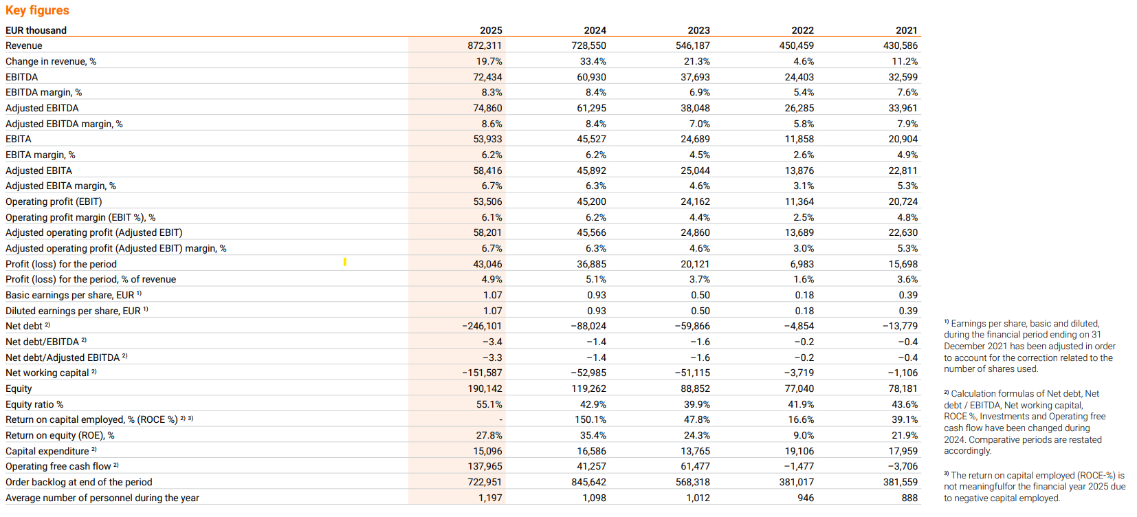 (2) The Company’s management has classified business acquisition purchase price debt included in the other non-current liabilities as an item of net working capital, because it is a longer interest-free payment period obtained for part of the purchase price. In addition, the other financial liability included in other non-current liabilities in 2019–2021 has not been taken into account as part of net working capital due to the nature of the item. This item is an additional equity investment made by a subsidiary’s former shareholder (Aktieägartillskott), which must be returned to the original investor in the event that the subsidiary in question accumulates a corresponding amount of distributable funds.