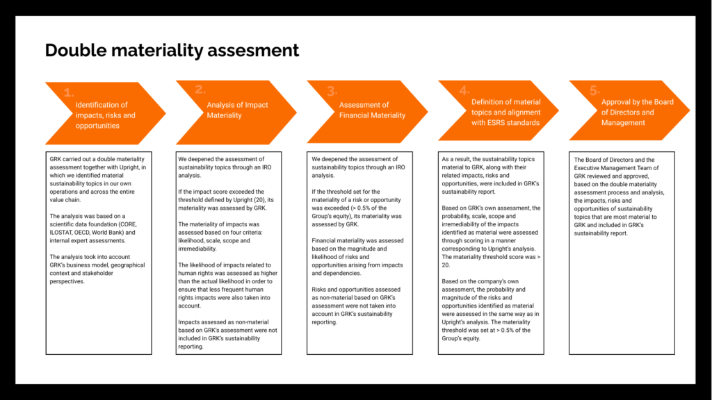The double materiality assessment carried out in accordance with the sustainability reporting directive is based on the Upright Project model. Building on this model, GRK conducted its own analysis to identify the key sustainability topics for GRK that have a significant impact either on our financial performance and/or on environmental and social impacts. All results of the double materiality assessment have been reviewed, amended where necessary, and approved by GRK.