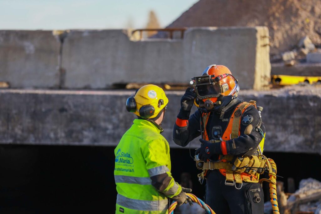 Tällä työmaalla Stella Maria -yrityksen sukeltajat toimivat rakentajien silminä veden alla. He tarkistavat, mitä räjäytys sai aikaan, ja varmistavat, että purku etenee suunnitellusti. Sukeltajat myös avustavat veden alle vajonneiden räjäytyssuojamattojen nostamisessa takaisin pintaan.